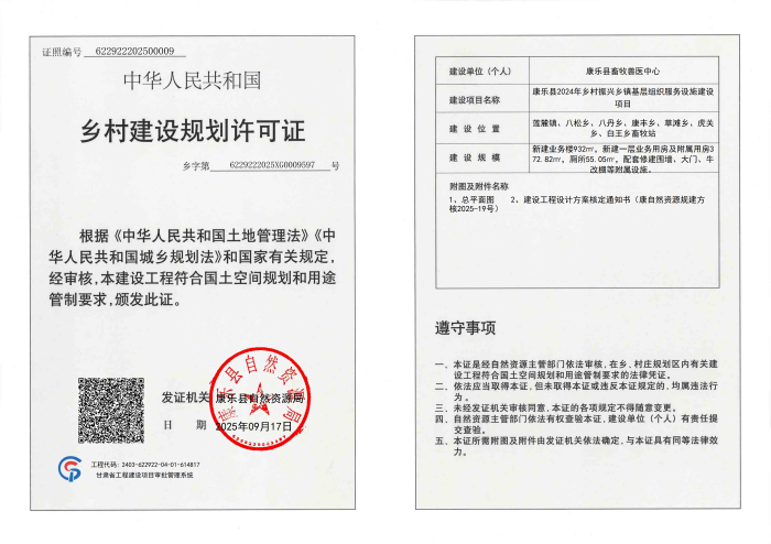 康乐县畜牧兽医中心向我单位申请办理康乐县2024年乡村振兴乡镇基层组织服务设施建设项目乡村建设规划许可证,我单位按程序对申报材料进行了审核并做出予以办理的决定,现依据《行政许可法》《城乡规划法》《自然资源领域基层政务公开标准指引》等相关法律规定,对许可证证载内容进行公布: