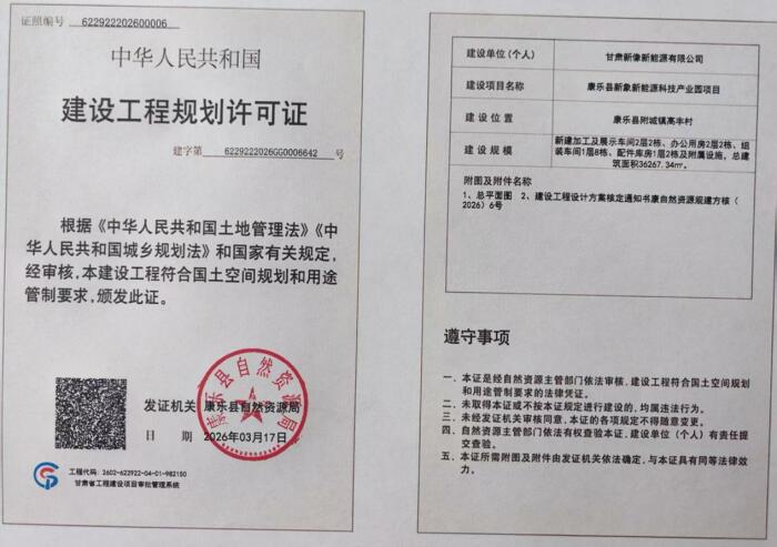 甘肃新像新能源有限公司向我单位申请办理康乐县新象新能源科技产业园项目建设工程规划许可证,我单位按程序对申报材料进行了审核并做出予以办理的决定,现依据《中华人民共和国行政许可法》《中华人民共和国城乡规划法》《自然资源领域基层政务公开标准指引》等相关法律规定,对许可证证载内容进行公布: