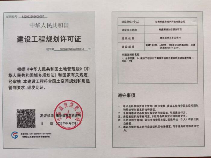 甘肃科盛房地产开发有限公司向我单位申请办理科盛澜境生态酒店项目建设工程规划许可证,我单位按程序对申报材料进行了审核并做出予以办理的决定,现依据《中华人民共和国行政许可法》《中华人民共和国城乡规划法》《自然资源领域基层政务公开标准指引》等相关法律规定,对许可证证载内容进行公布: