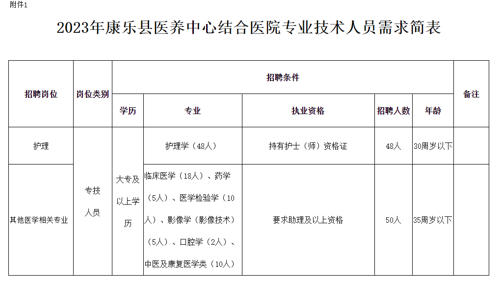 共计划招聘医护专业技术人员98名,详见《2023年康乐县医养中心结合医院公开招聘人员岗位简表》(附件1)。