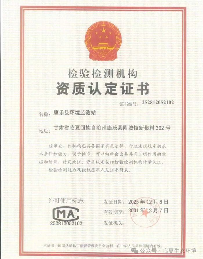 康乐县环境监测站顺利取得环境监测资质认定证书