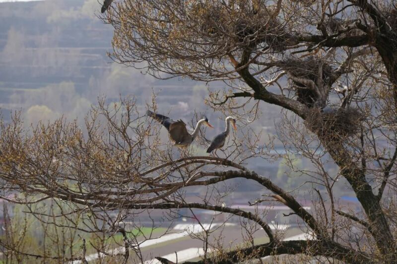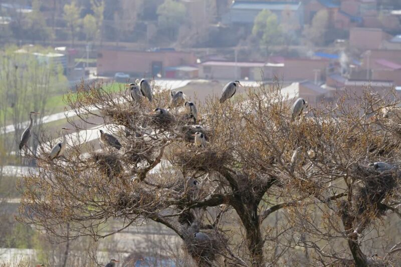 春日迟迟,晏家村的苍鹭正在衔枝筑巢。每年三月,春风刚刚翻过黄土高原的梁峁,村里几棵高大杨树便迎来它们的“老住户”——数百只苍鹭如期归巢,在古树枝头筑巢安家、繁衍生息,绘就康乐生态最动人的名片。