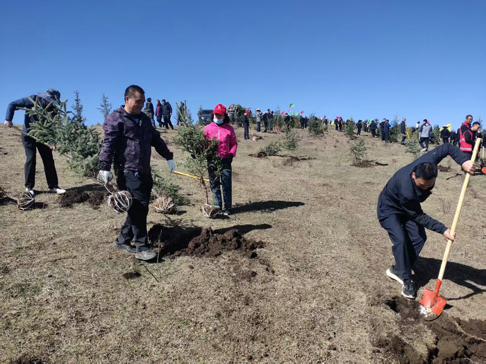 4月17日,县地震局干部职工到鸣鹿乡鸣关村塔东梁开展义务植树活动。