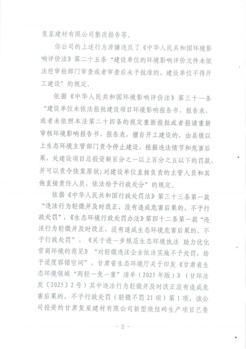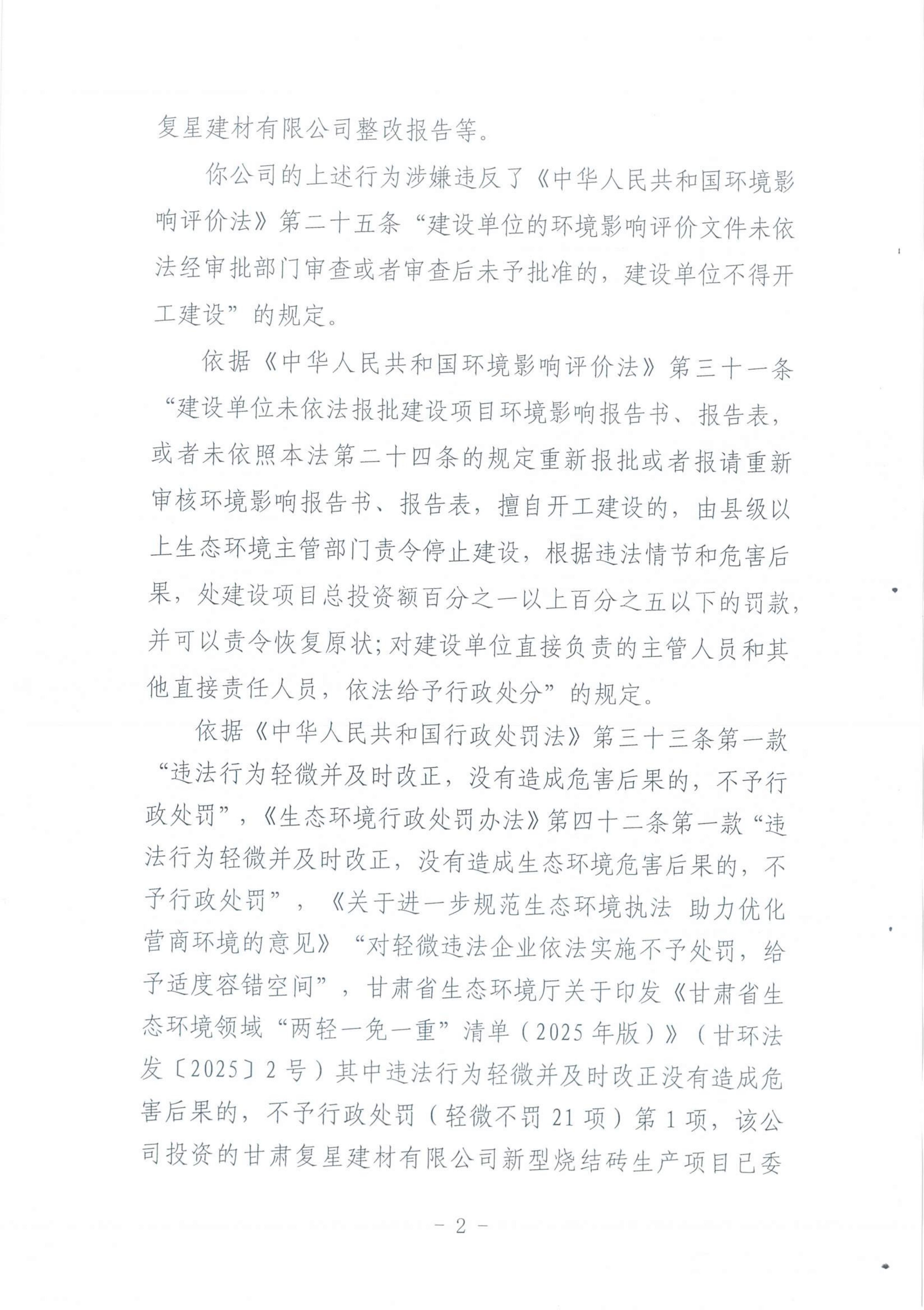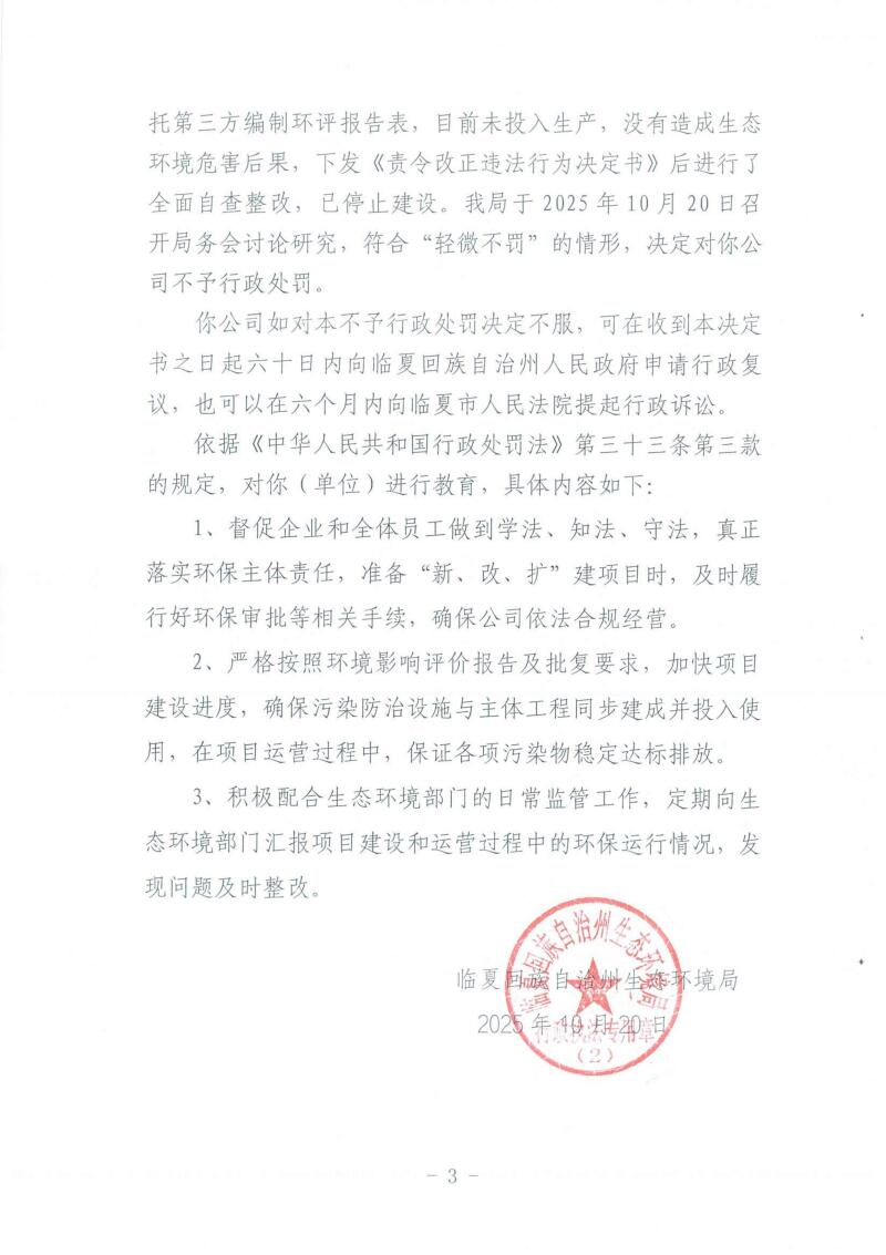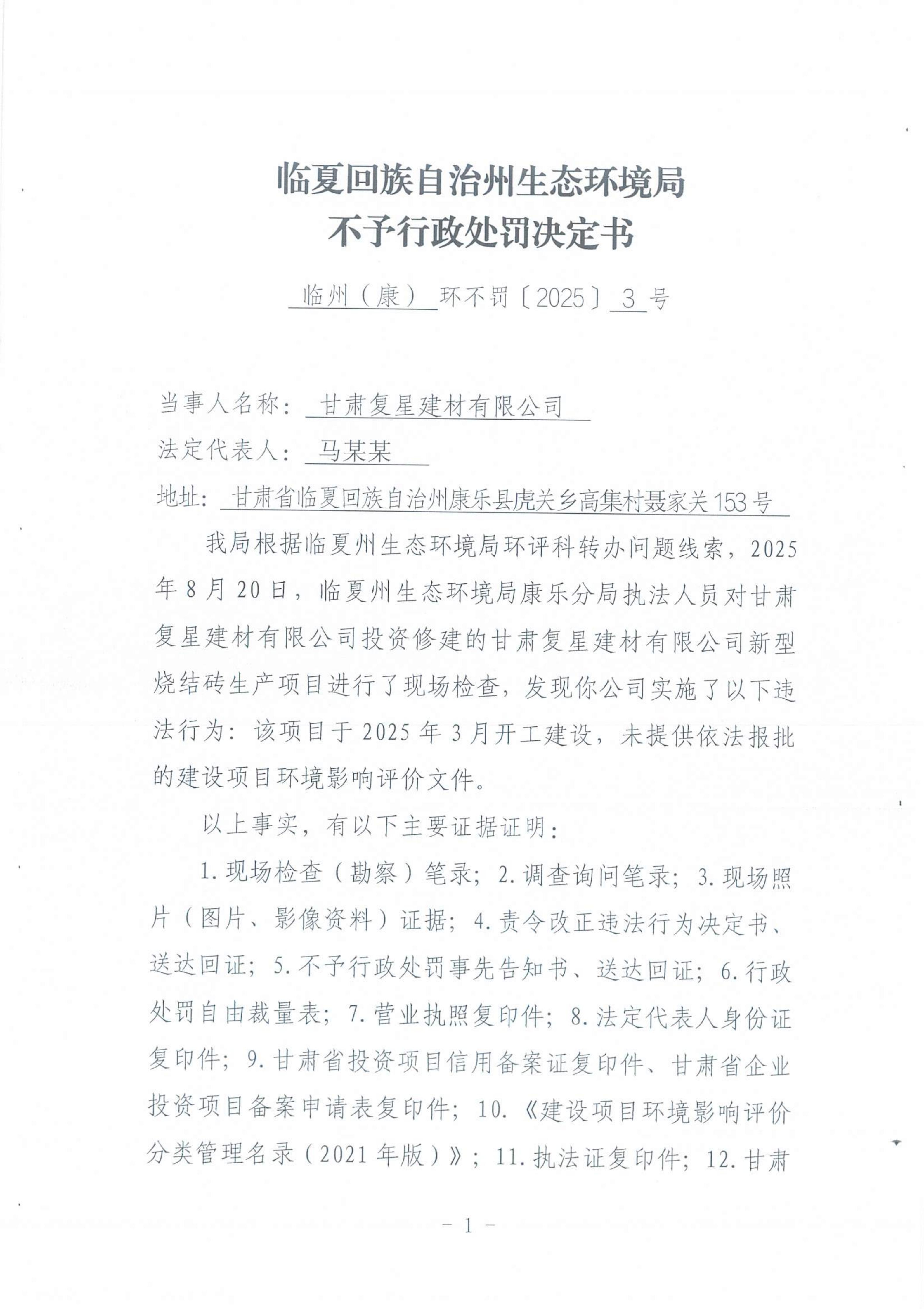 临夏回族自治州生态环境局不予行政处罚决定书 临州(康)环不罚〔2025〕3号